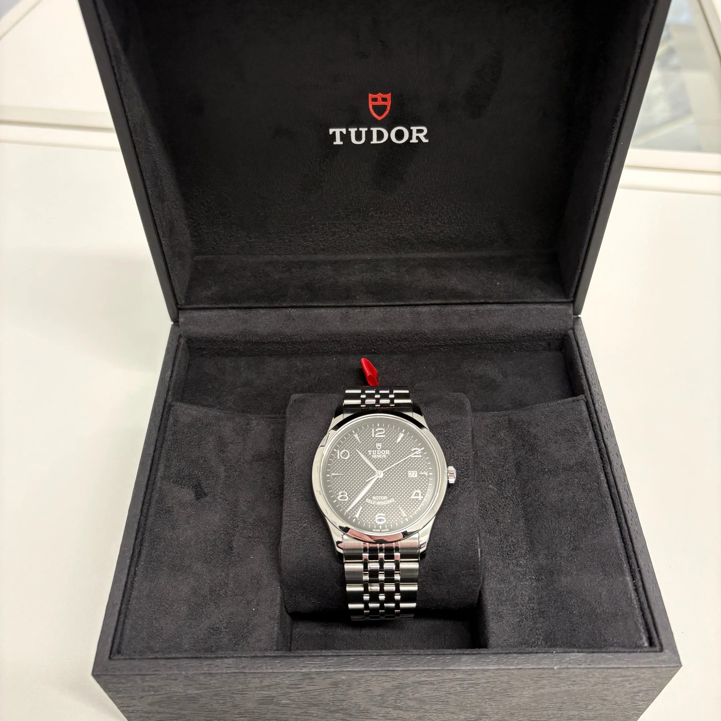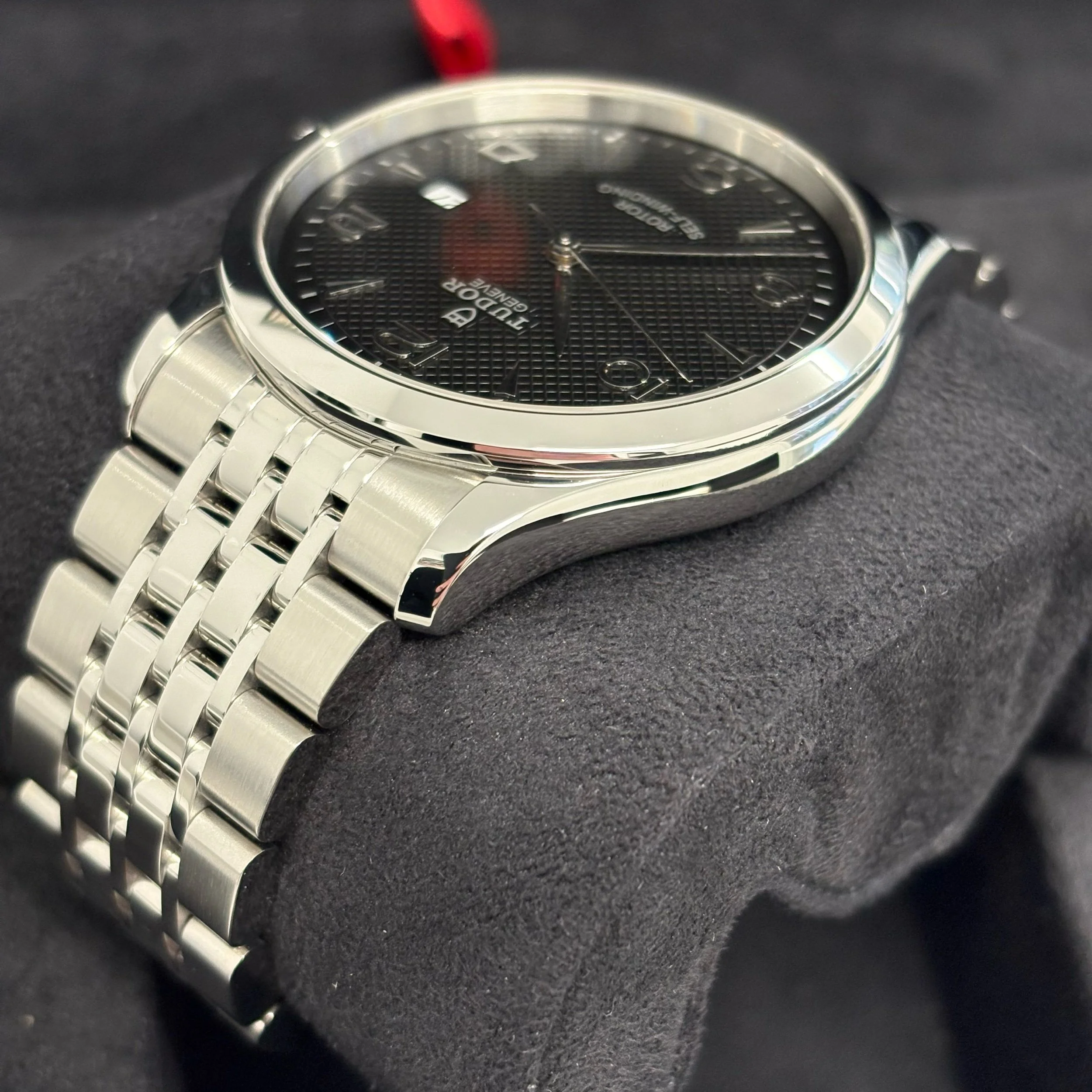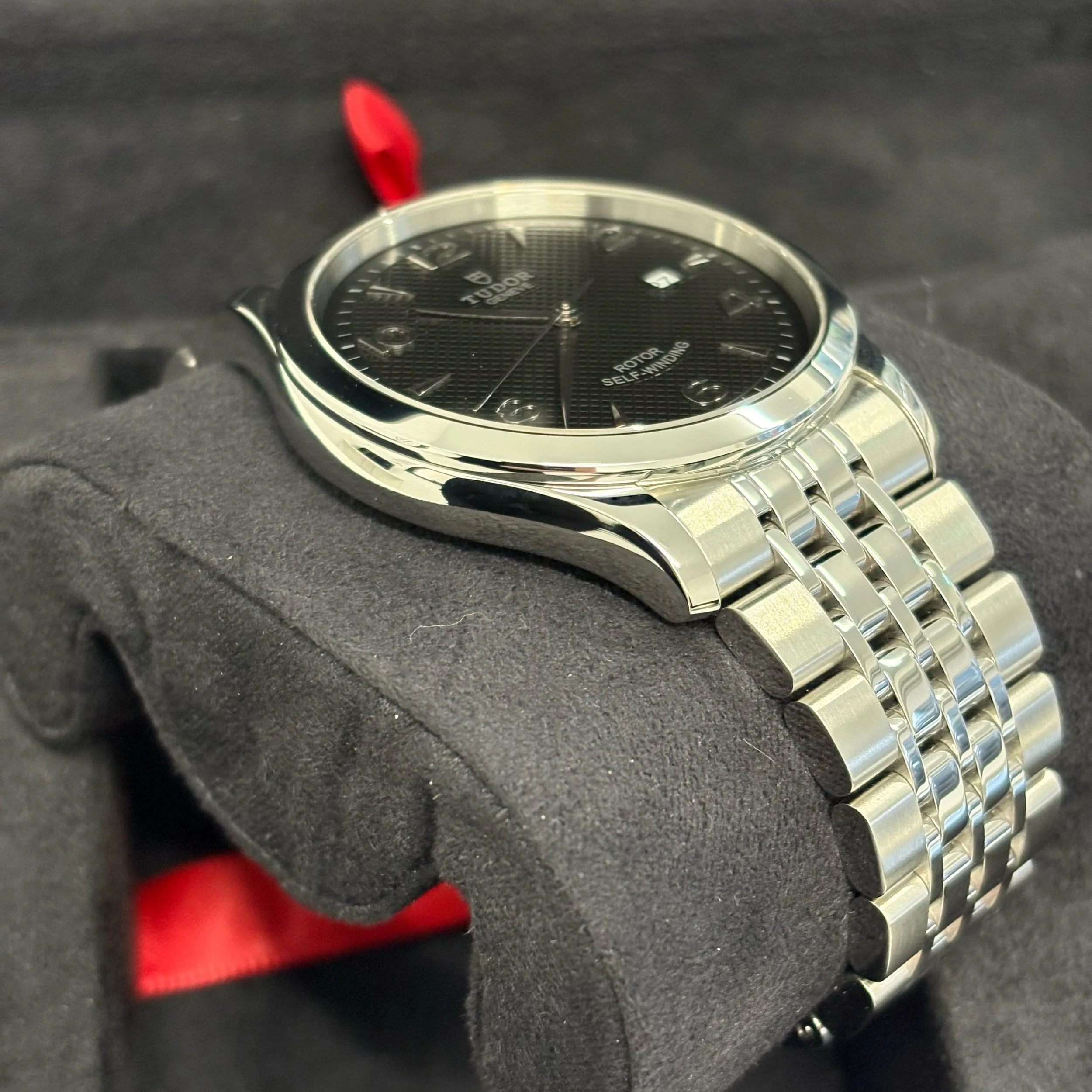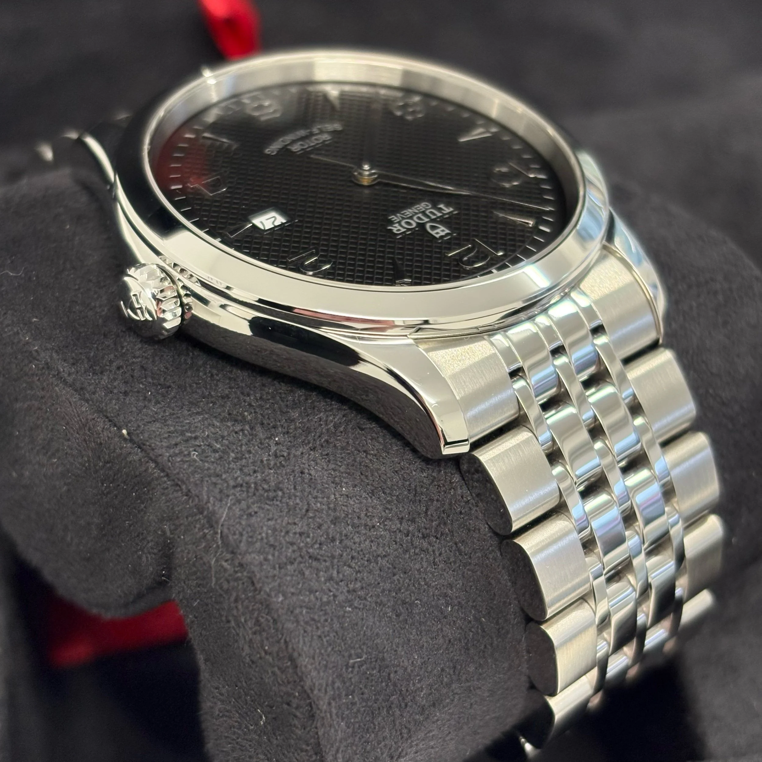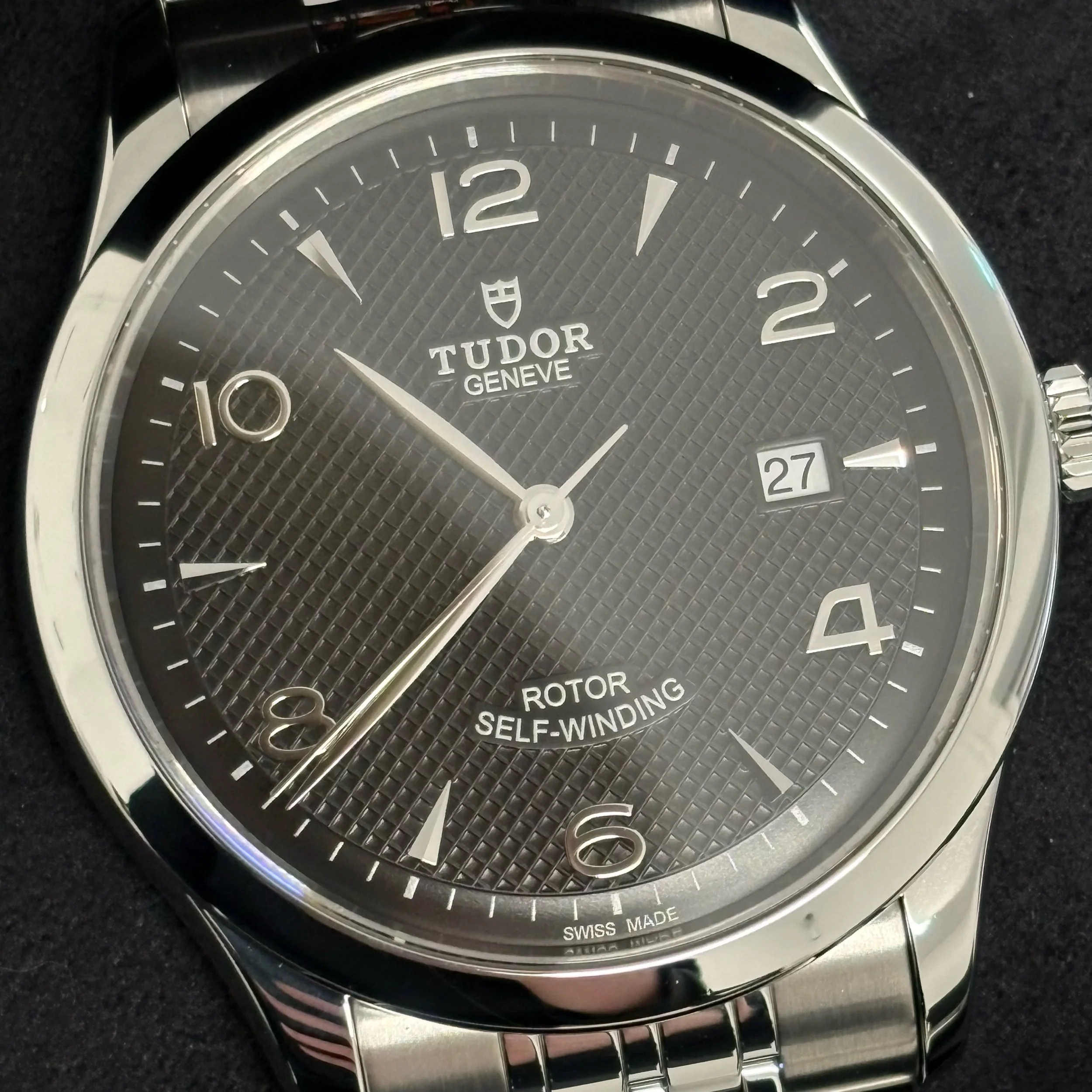 Black, embossed decoration, domed rhodium-plated hour markers and hands, date at 3 o’clock
