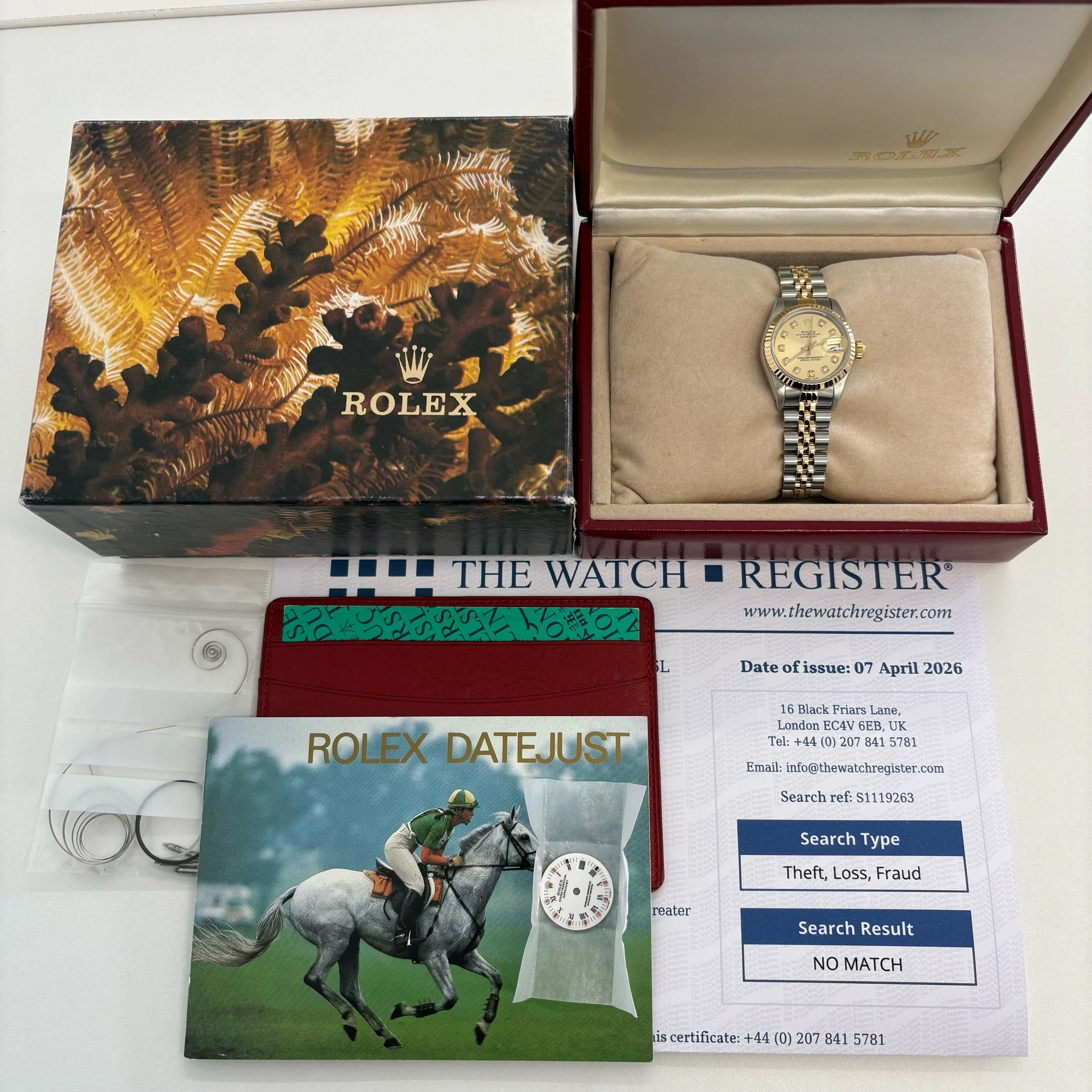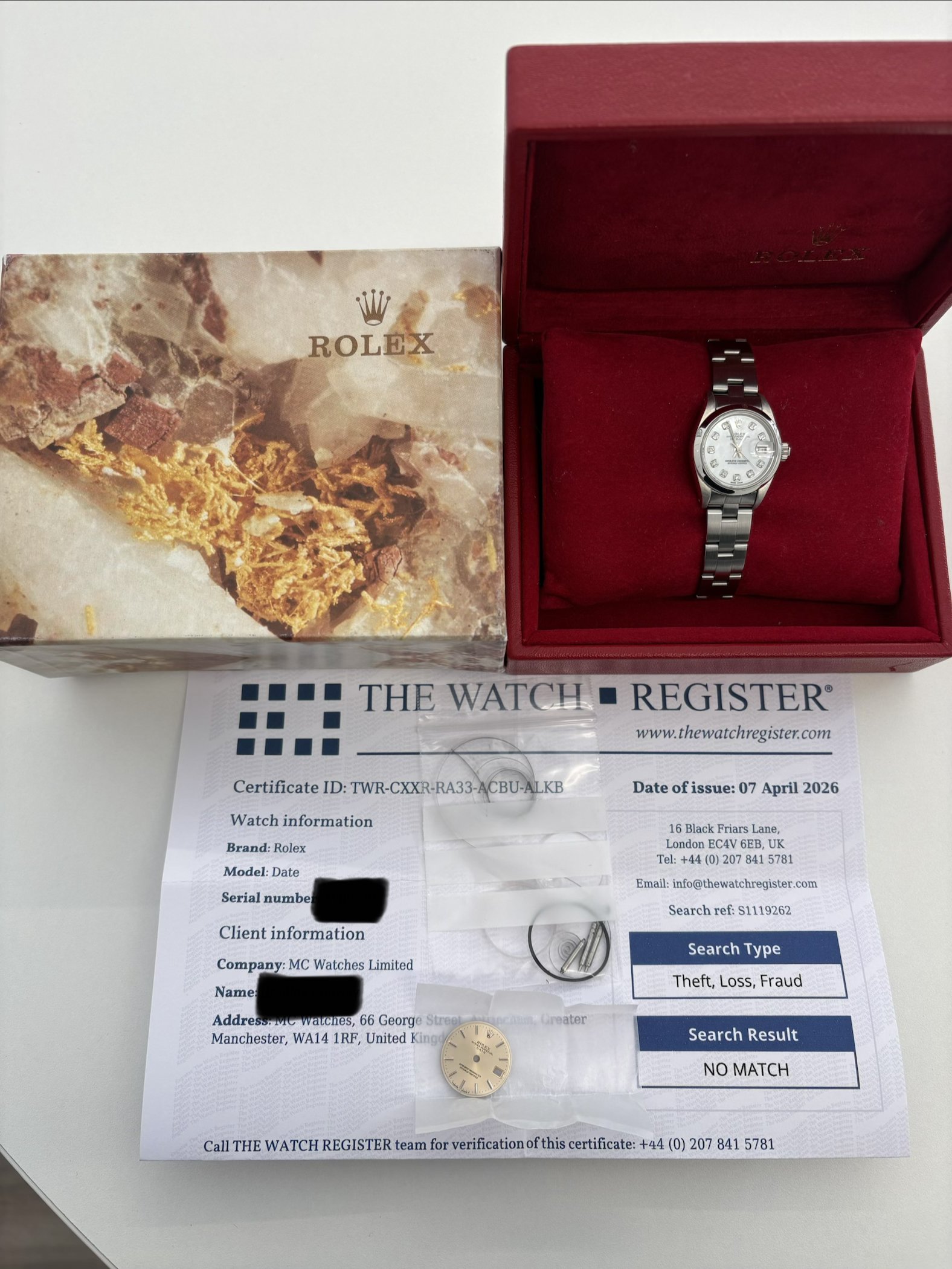 Watch, box, papers and watch register print out